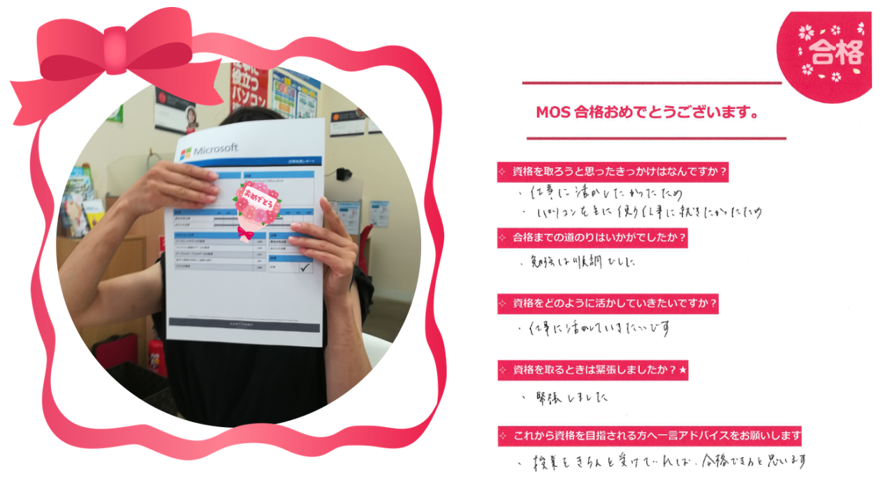この度、MNさんが「MOS Excel 2019」に合格されました。